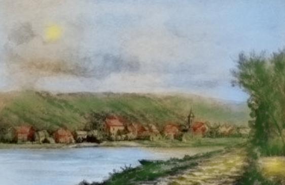 Cette peinture nous montre Cheratte vue du chemin de halage de Chertal, une toile de Pauline Jamar qui date de plus d'un siècle (cette artiste a vécu de 1850 à 1911), elle a été peinte peut-être sur l'endroit d'où doit parir le pont "sud" d'Oupeye vers Cheratte, c'est donc une oeuvre qui est bel et bien d'actualité alors que se profile pour les prochaines années le réaménagement socio-écologique et économique de la grande friche industrielle abandonnée par Arcelor sur la "presqu'île de Chertal".